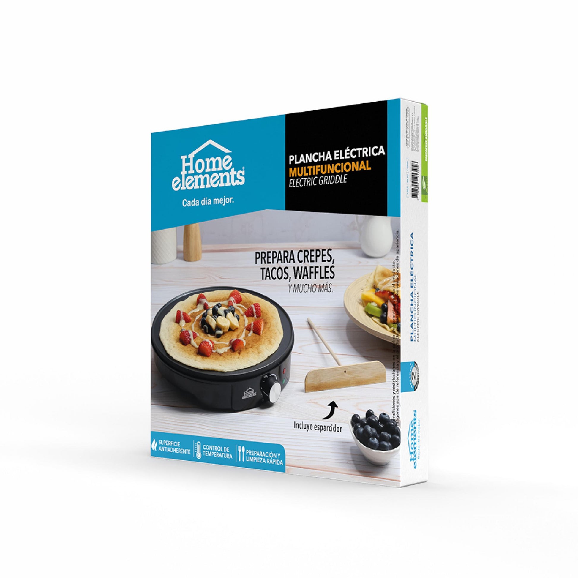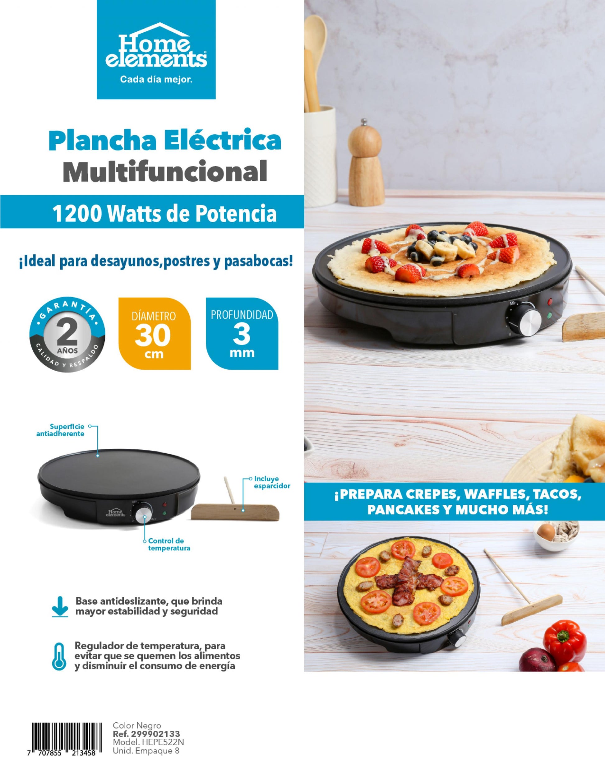 Haz que tus desayunos y pasabocas sean inolvidables con la Plancha Eléctrica Multifuncional Home Elements. Con 1200 watts de potencia, te permite preparar crepes, waffles, tacos, pancakes, arepas y mucho más, de forma rápida y uniforme. Su superficie antiadherente evita que los alimentos se peguen y facilita la limpieza, mientras que su control de temperatura te ayuda a cocinar sin quemar y a optimizar el consumo de energía. Incluye esparcidor de masa para lograr crepes perfectos y cuenta con base antideslizante que brinda estabilidad y seguridad. ¡La herramienta ideal para quienes aman cocinar fácil, rápido y delicioso!, Peso (Kg) 1,1, Alto 33, Ancho 8, Largo 3205