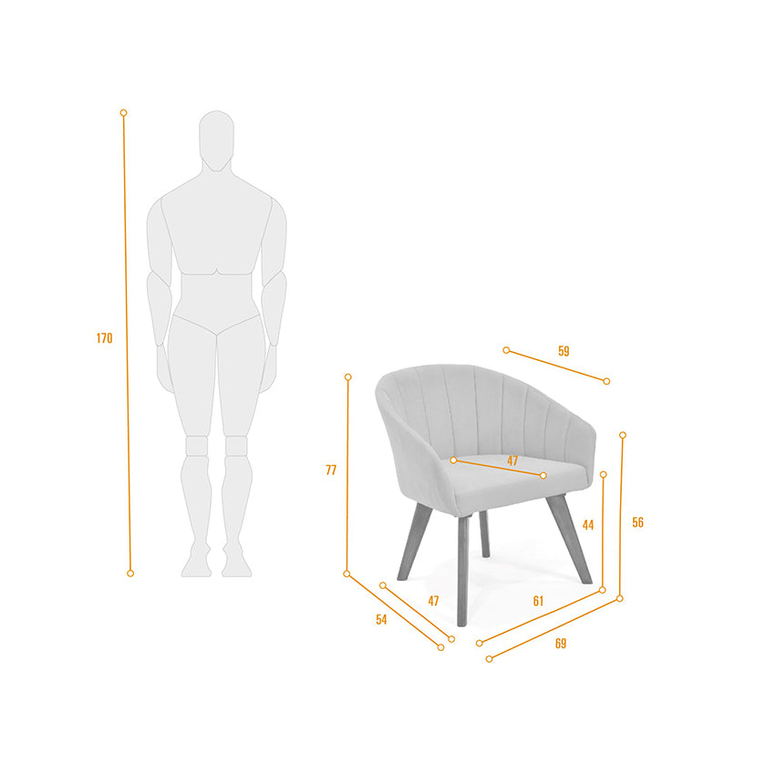Sofisticación y elegancia está fabricada en estructura metálica con asiento en MDF. Relleno con espuma de alta densidad politex en la parte inferior tapizada en tela poliéster de excelente calidad y cuenta con patas en madera pino.Dimensiones: 69 cm ancho x 54 cm largo x 77 cm alto.Peso: 9 kg - Peso que soporta: 150 kg.Incluye: 1 Poltrona.No incluye elementos decorativos.Ensamble: Requiere ajustar base con tornillos Bristol.El color del mobiliario en la fotografía es una aproximación al color real puede variar por la luz ambiente y la diferencia en la resolución de la pantalla del computador o dispositivo móvil.