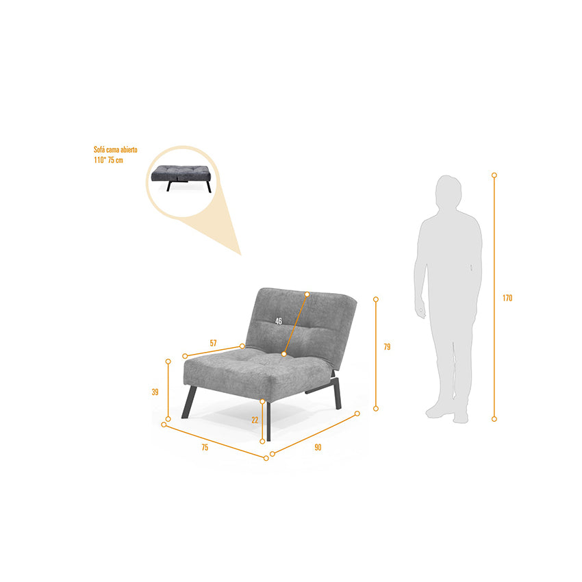 Modernidad y practicidadEsta poltrona reclinable de 1 puesto es moderna y funcional. Cuenta con sistema de reclinación en 3 posiciones tiene estructura en madera pino inmunizada naturalmente sus patas metálicas añaden un toque de sofisticación y estabilidad tiene relleno en espuma de alta densidad tapizado en tela de poliéster de excelente calidad. Cuando se reclina totalmente tiene medidas de 110cm x 75cm x 39cm. Es una opción práctica para cualquier hogar que busque maximizar el uso del espacio sin sacrificar el diseño.Dimensiones: 75 cm ancho x 90 cm largo x 79 cm altoPeso del Producto: 33 kg - Peso que soporta: 180 kgIncluye: 1 Poltrona.No incluye elementos decorativos.Ensamble: Requiere ajustar la pata con tornillos drywallEl color del mobiliario en la fotografía es una aproximación al color real puede variar por la luz ambiente y la diferencia en la resolución de la pantalla del computador o dispositivo móvil.