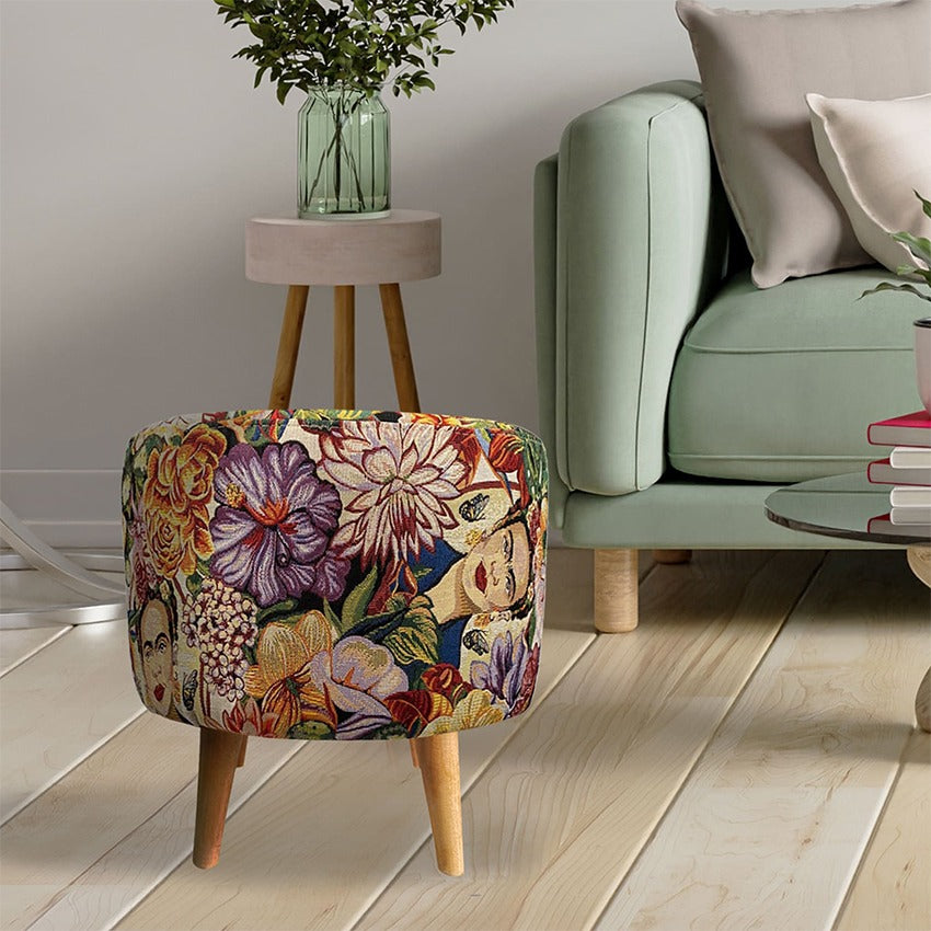 Puff Redondo tapizado en tela tipo gobelino frida estructura en madera natural espuma de alta densidad y cuatro patas en madera natural.