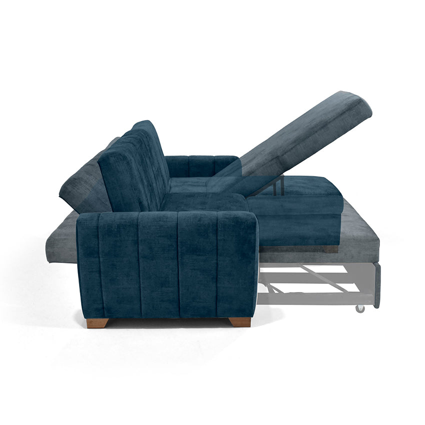Su diseño amplio y espacioso lo hace ser adecuado para grandes espacios proporciodo un toque de elegancia y practicidad. La sala Apolo conformada por el sofá cama y el chaise tiene estructura y patas en madera pino inmunizada naturalmente relleno de espuma de alta densidad tapizado en tela de poliéster de excelente calidad. Tiene sistema de reclinación clic clack que permite ajustar el respaldo en tres posiciones diferentes además cuenta con herraje de cajón que permite desplegar otro módulo para completar la cama. En modo cama es de 180 cm x 185 cm. El chaise incluye un compartimiento interno que funciona como baúl con unas dimensiones de 104 cm x 57 cm x 21 cm.Dimensiones: 220 cm ancho x 160 cm largo x 92 cm altoPeso: 92 kg - Peso que soporta: 300 kgIncluye: 1 Sala en L Multifuncional.No incluye elementos decorativos.No requiere ensamble por parte del clienteEl color del mobiliario en la fotografía es una aproximación al color real puede variar por la luz ambiente y la diferencia en la resolución de la pantalla del computador o dispositivo móvil.
