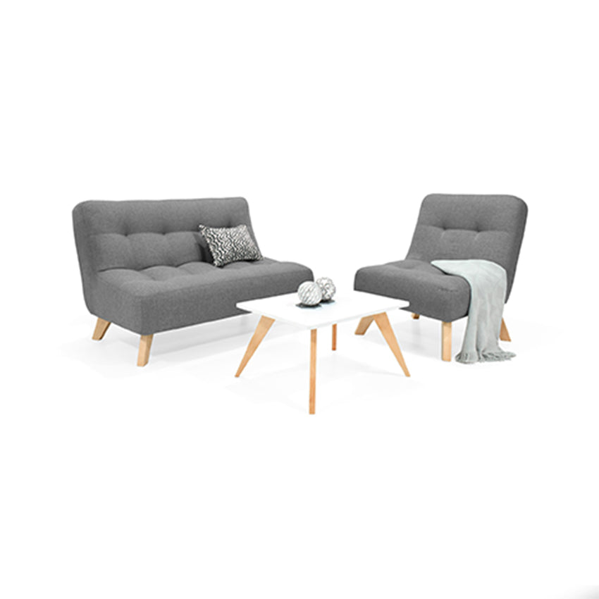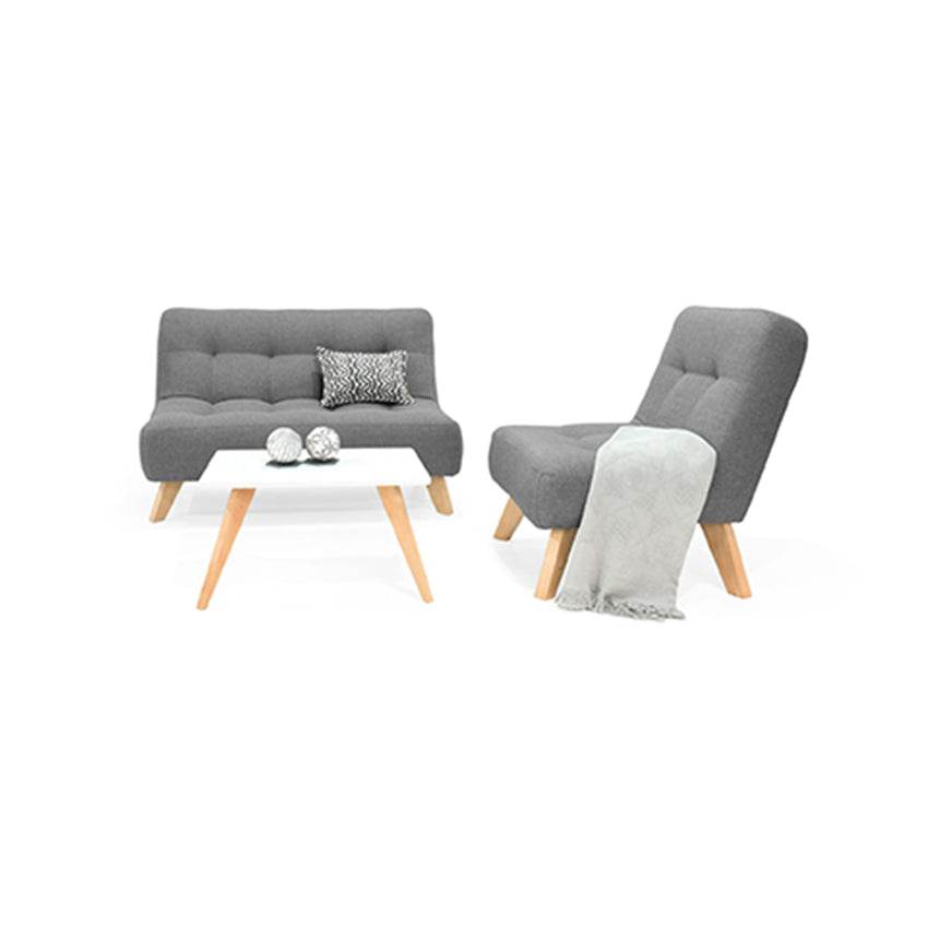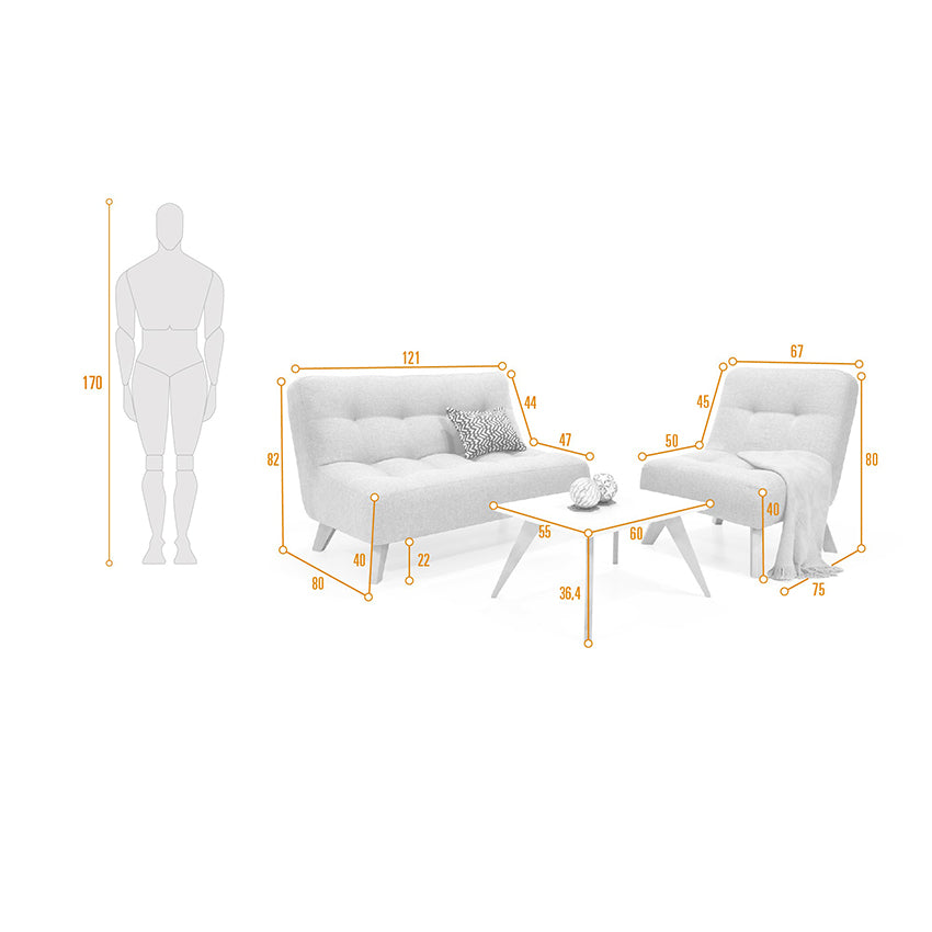 Diseño minimalista que combina en los espacios.El Sofá Navara y la poltrona Porto están fabricados en una fuerte estructura de madera pino inmunizada naturalmente relleno en espuma de alta densidad y tapizados en tela poliéster. Cuentan con patas en madera pino pintadas con laca catalizada para acabado brillante. La Mesa de Centro Nova cuenta con bases en madera pino y superficie en madera aglomerada.Dimensiones y peso:Sofá: 121 cm ancho x 80 cm largo x 82 cm alto. Peso del Producto: 35 kg - Peso que soporta: 240 kgPoltrona: 67 cm ancho x 75 cm largo x 80 cm alto. Peso del Producto: 12 kg - Peso que soporta: 300 kgMesa De Centro: 60 cm ancho x 55 cm largo x 36 4 cm alto. Peso del Producto: 5 kg - Peso que soporta: 40 kgIncluye: 1 Sofá 1 Poltrona 1 Mesa De Centro.No incluye elementos decorativos.Ensamble:Sofá y poltrona: Requiere enroscar la pata en sentido horario hasta ajustarlaMesa De Centro: Requiere ajustar la platina con tornillos drywallEl color del mobiliario en la fotografía es una aproximación al color real puede variar por la luz ambiente y la diferencia en la resolución de la pantalla del computador o dispositivo móvil.