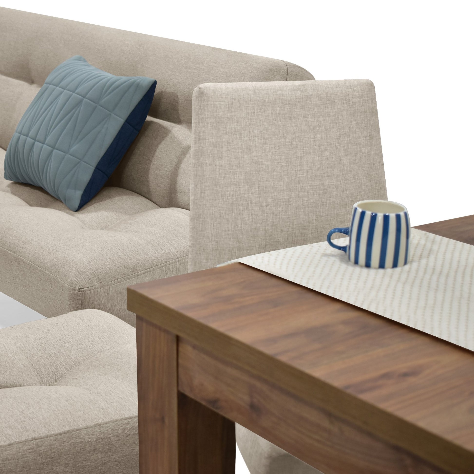 La sala Porto se encuentra fabricada en una estructura y patas de madera pino espuma de alta densidad tapizada en tela poliéster de excelente calidad su diseño cuenta con capitoneado. El sofá cama es tapizado con tela brioni en la parte posterior se puede reclinar en 3 posiciones en modo cama el ancho es de 106 cm. La mesa de centro Nova tiene una superficie en madera aglomerada y patas en madera pino.El comedor Mérida 6 puestos está elaborado en una fuerte estructura de MDP y MDF. Las sillas Viena están fabricadas en estructura y patas metálicas relleno en espuma y tapizado en tela poliéster. El butaco tiene estructura en madera pino y MDF relleno de espuma y tapizado en tela poliéster. Patas en madera pino.