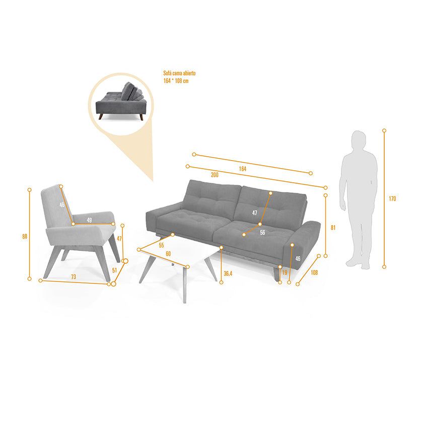 Haz que cada espacio sea único. El sofá cama Suiza tiene estructura fabricada en madera pino inmunizada naturalmente relleno con espuma de alta densidad y guata tapizado en tela poliéster de excelente calidad y patas en madera pino acabado lacado. Tiene sistema de reclinación click-clack que permite ajustar el respaldo en tres posiciones diferentes. Cuando se despliega en modo cama es de 164x18 cm proporcionando un espacio amplio y confortable para descansar. La poltrona Islandia está fabricada en una fuerte estructura de madera pino con el asiento tapizado en tela poliéster de excelente calidad. La Mesa de Centro Nova cuenta con bases en madera pino y superficie en madera aglomerada.Dimensiones y peso:Sofá Cama: 200 cm ancho x 108 cm largo x 81 cm altoPeso del Producto: 37 kg - Peso que soporta: 280 kgPoltrona: 51 cm ancho x 73 cm largo x 88 cm altoPeso del Producto: 7 9 kg - Peso que soporta: 150 kgMesa de Centro: 60 cm ancho x 55 cm largo x 36 4 cm altoPeso del Producto: 5 kg - Peso que soporta: 40 kg