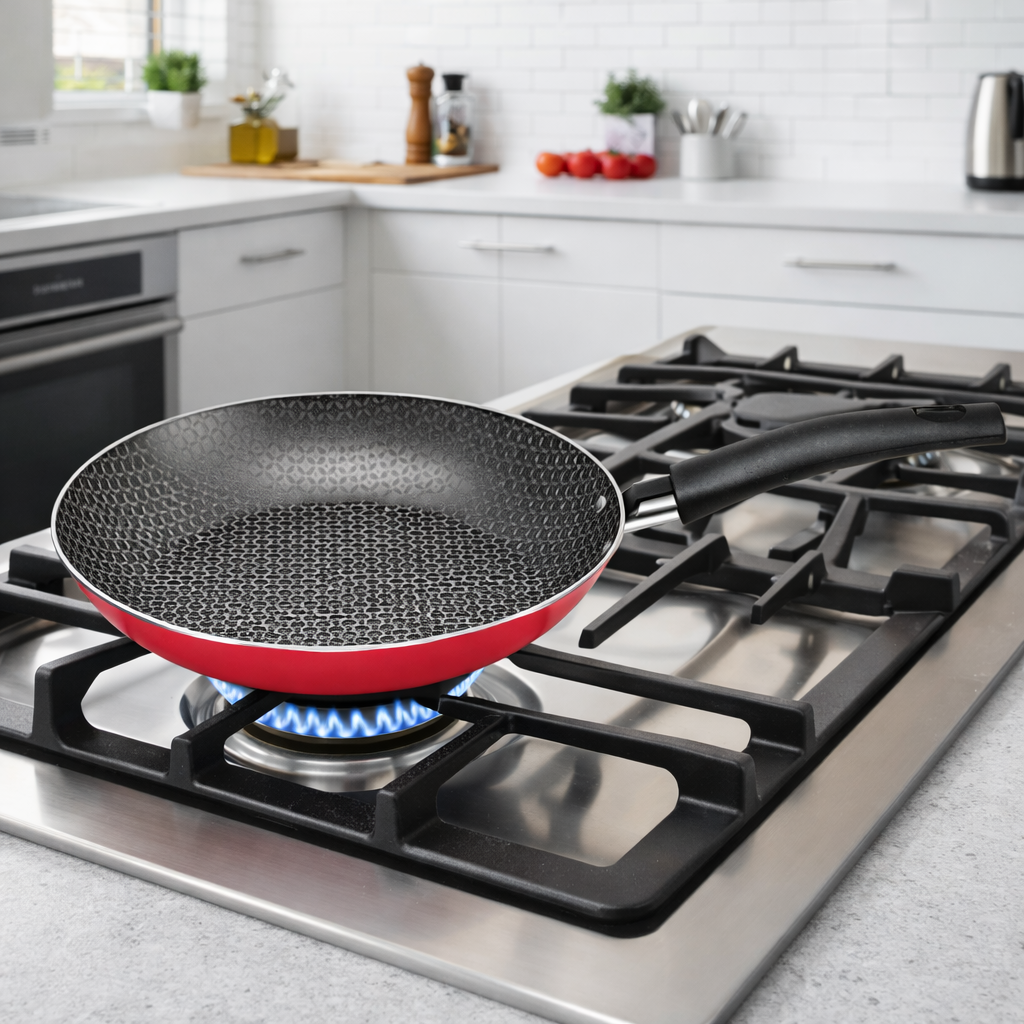 El sartén Red está pensado para quienes buscan equilibrio entre potencia y versatilidad. Fabricado en aluminio de 99,7 % de pureza, con revestimiento interno de 7 capas antiadherentes y mango de baquelita antitérmica, asegura una cocción eficiente, uniforme y segura. Su diámetro de 24 cm y capacidad de 1,10 L lo convierten en un aliado estratégico para preparaciones más amplias, donde el control y el rendimiento van de la mano. Un diseño con carácter que transforma la rutina en resultados consistentes.