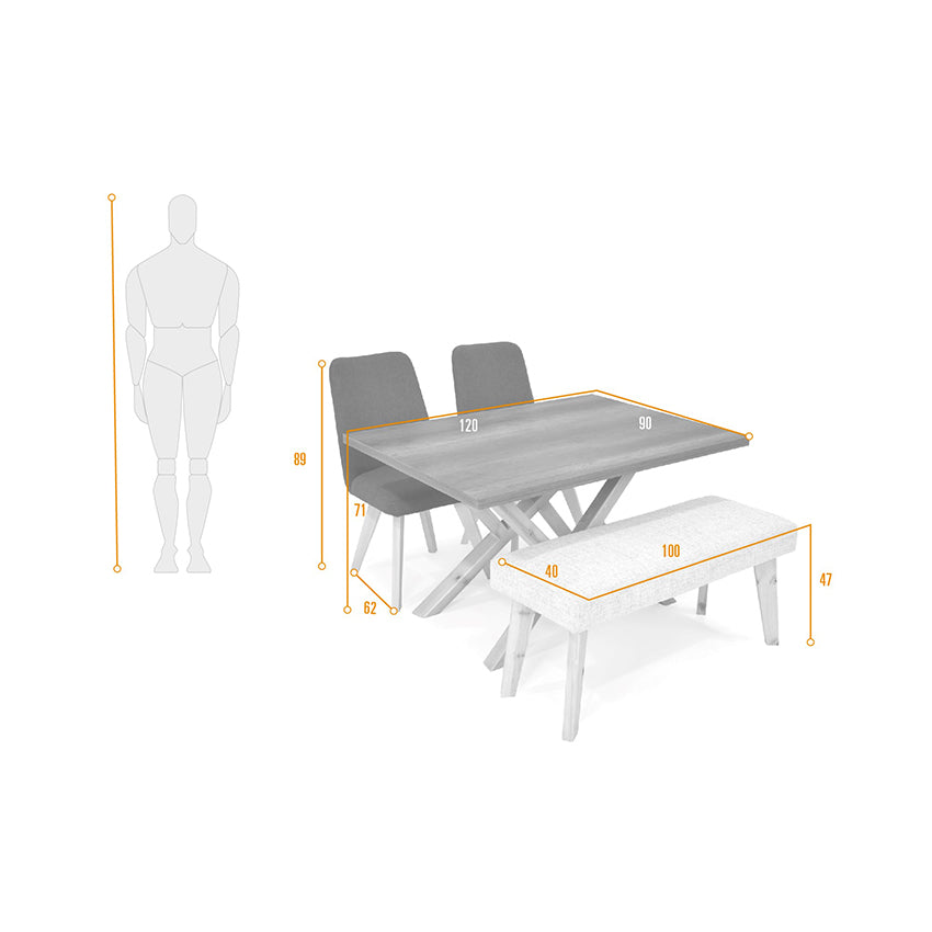 Elegancia y funcionalidad. La mesa de comedor cuenta con superficie en madecor de 15 mm con reengruese en MDF acabado canto flexible. Tiene 2 patas en forma de X en madera pino con acabado en laca. La silla tiene estructura metálica resistente asiento de MDF y patas de madera pino lacadas. El relleno de espuma de alta densidad y el tapizado en tela de poliéster de calidad. El Butaco es fabricado en una fuerte estructura de madera pino y MDF relleno de espuma de alta densidad y es tapizado en tela poliéster. Cuenta con patas en madera pino pintadas con laca catalizada para acabado brillante.Dimensiones y peso:Mesa De Comedor: 120 cm ancho x 90 cm largo x 71 cm altoPeso del Producto: 28 kg - Peso que soporta: 110 kgSilla: 45 cm ancho x 62 cm largo x 89 cm altoPeso del Producto: 6 kg - Peso que soporta: 120 kgButaco: 100 cm ancho x 40 cm largo x 47 cm altoPeso del Producto: 8 kg - Peso que soporta: 220 kgIncluye: 1 Mesa De Comedor 2 Sillas 1 Butaco.No incluye elementos decorativos.