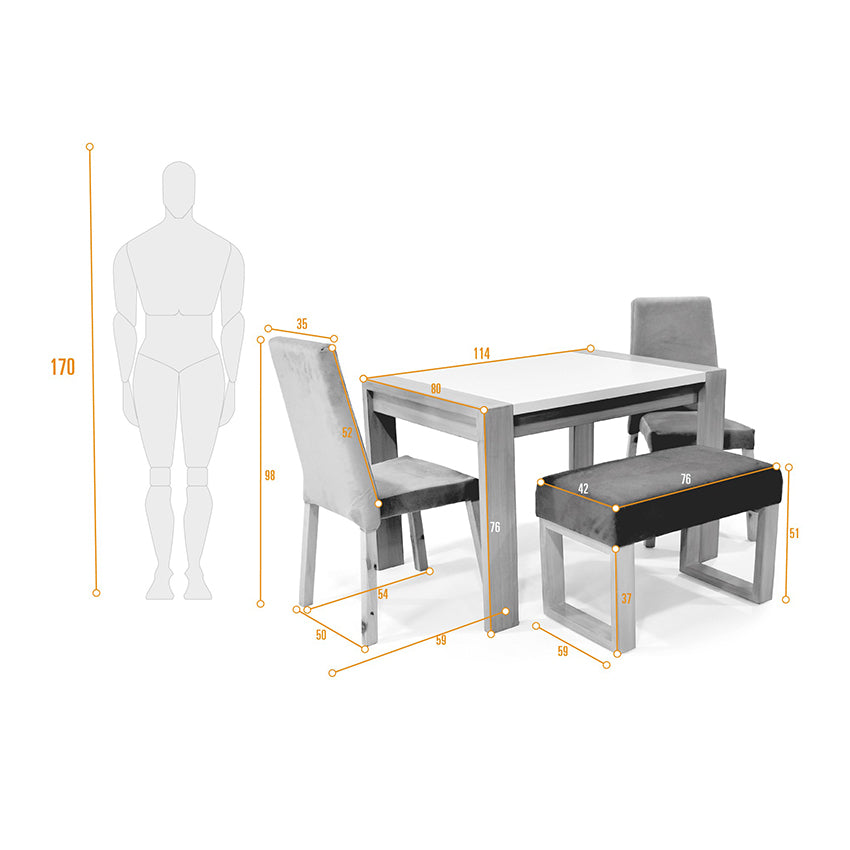 Ideal para espacios que quieran lucir tranquilos y acogedoresLa mesa de comedor tiene estructura en pino en forma de U con acabado en laca tiene una tapa en madecor de 15 mm con reengruese de mdf de 18 mm acabado en canto flexible. El butaco de 1 puesto y la silla están fabricados en una fuerte estructura de madera pino cuenta con espuma de alta densidad y están tapizados en tela poliéster de excelente calidad.Dimensiones y peso:Mesa De Comedor: 114 cm ancho x 80 cm largo x 76 cm altoPeso del Producto: 24 kg - Soporta: 150 kgButaco: 76 cm ancho x 42 cm largo x 51 cm altoPeso del Producto: 10 kg - Soporta: 120 kgSilla: 50 cm ancho x 59 cm largo x 98 cm altoPeso del Producto: 5.5 kg - Soporta: 150 kgIncluye: 1 Mesa de Comedor 1 Butaco 2 Sillas.No incluye elementos decorativos.Ensamble:Mesa De Comedor: Requiere ajustar la pata con tornillos bristolButaco: Requiere ajustar el herraje con tornillo bristol y tuerca de uñaLas sillas no requieren ensamble por parte del cliente.El color del mobiliario en la fotografía es una aproximación al color real puede variar por la luz ambiente y la diferencia en la resolución de la pantalla del computador o dispositivo móvil.