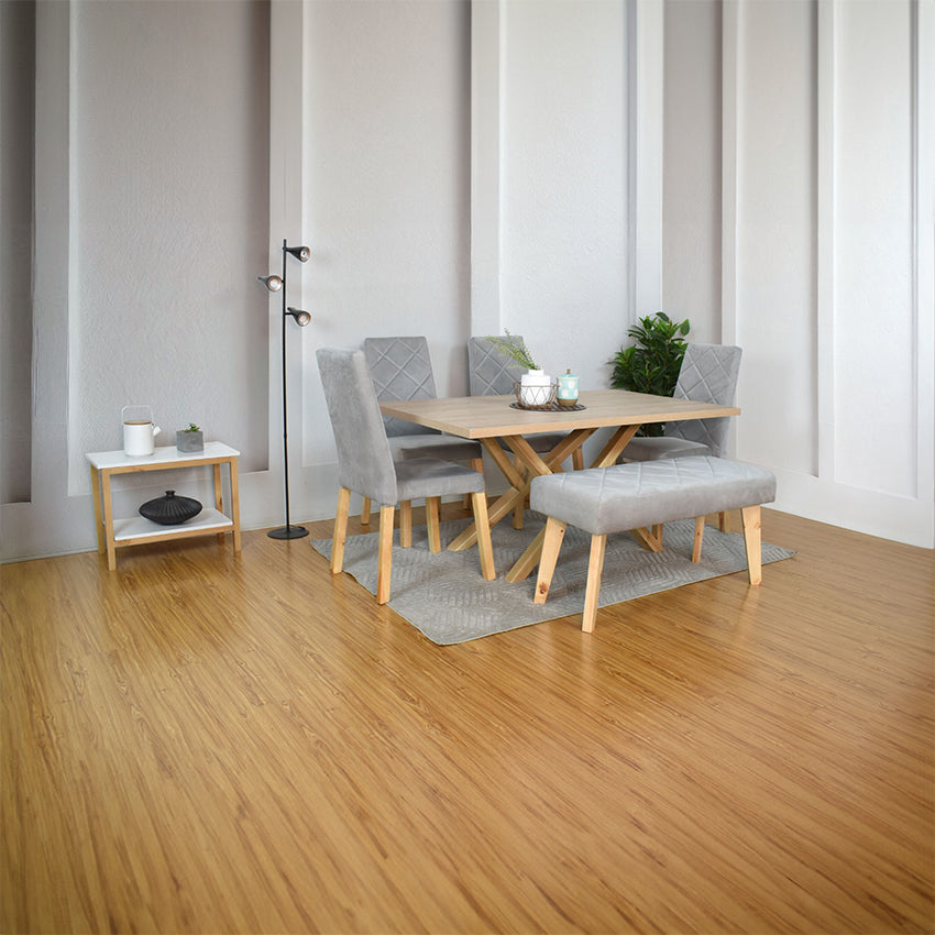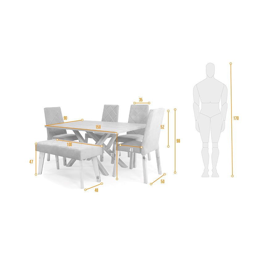 Modernidad y elegancia. La mesa de comedor cuenta con superficie en madecor de 15 mm con reengruese en MDF acabado canto flexible. Tiene 2 patas en forma de X en madera pino con acabado en laca. La Silla y el Butaco Liverpool es fabricada en madera pino rellena con espuma de alta densidad y tapizada con tela poliéster.Dimensiones y peso:Mesa De Comedor: 150 cm ancho x 90 cm largo x 71 cm altoPeso del Producto: 32 kg - Peso que soporta: 110 kgSilla: 50 cm ancho x 59 cm largo x 98 cm altoPeso del Producto: 6 5 kg - Peso que soporta: 150 kgButaco: 100 cm ancho x 40 cm largo x 47 cm altoPeso del Producto: 8 kg - Peso que soporta: 220 kgIncluye: 1 Mesa De Comedor 4 Sillas 1 Butaco.No incluye elementos decorativos.