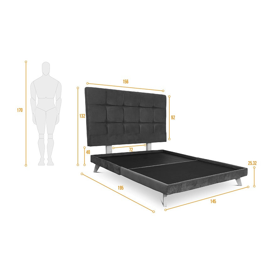Comodidad y elegancia. El Cabecero tiene estructura de madera pino inmunizada naturalmente y el relleno de espuma de alta densidad garantizan un soporte excepcional. El tapizado en tela de poliéster el detalle de capitoneado en el espaldar y su tapizado con tela brioni en el respaldo añaden un toque de elegancia. Además las patas de madera de pino brindan estabilidad y durabilidad. La Base Cama Verona es elaborada en una fuerte estructura de madera pino inmunizada naturalmente cuenta con relleno en espuma y tendido de tablas. Está tapizada en tela poliéster y politex en la parte interior. Cuenta con patas en madera pino.Dimensiones y peso:Cabecero Capitoneado: 156 cm ancho x 10 cm largo x 132 cm altoPeso del Producto: 16 kg.Base Cama: 145 cm ancho x 195 cm largo x 25 32 cm altoPeso del Producto: 38 kg - Peso que soporta: 185 kgIncluye: 1 Cabecero Capitoneado 1 Base Cama.No incluye elementos decorativos.Ensamble:Cabecero Capitoneado: Requiere ajustar las patas con tornillos Drywall.Base Cama: Requiere enroscar las patas en sentido horario hasta ajustarla.