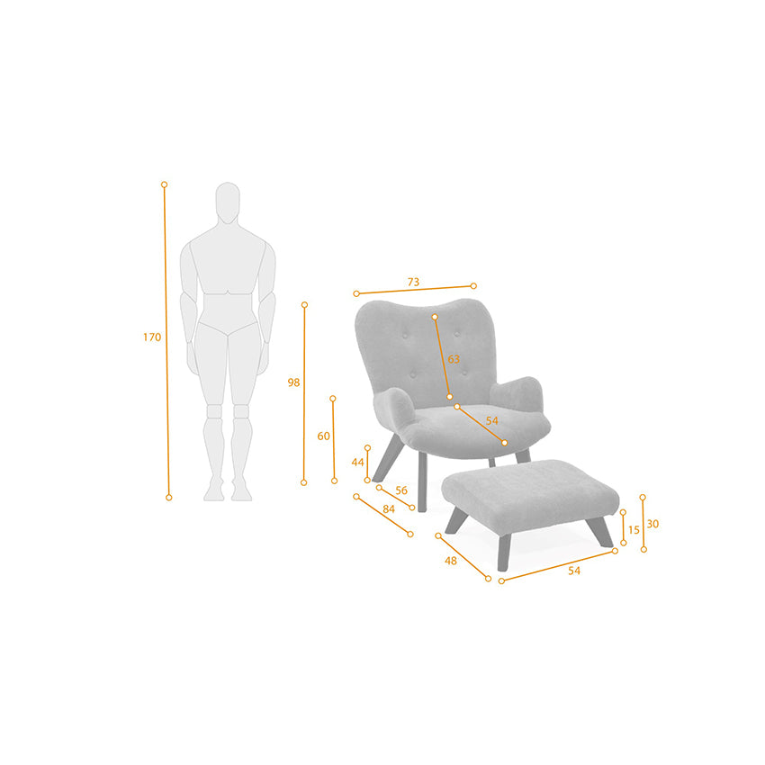 Su diseño brinda una excelente comodidad y practicidad en espacios que quieran lucir tranquilos confortables. La poltrona está fabricada en una fuerte estructura de metal y el Puff en una fuerte estructura de madera pino. La poltrona y el puff cuentan con asiento en madera pino relleno con espuma de alta densidad patas en madera pino pintadas tapizado en tela poliéster de excelente calidad.Dimensiones y peso:Poltrona: 59 cm ancho x 84 cm largo x 98 cm altoPeso del Producto: 12 kg - Soporta: 120 kgPuff: 54 cm ancho x 48 cm largo x 30 cm altoPeso del Producto: 4 kg - Soporta: 150 kgIncluye: 1 Poltrona 1 Puff.No incluye elementos decorativos.Ensamble:Poltrona y Puff: Requiere ajustar las patas con tornillo mixto y tuerca de uña.El color del mobiliario en la fotografía es una aproximación al color real puede variar por la luz ambiente y la diferencia en la resolución de la pantalla del computador o dispositivo móvil.
