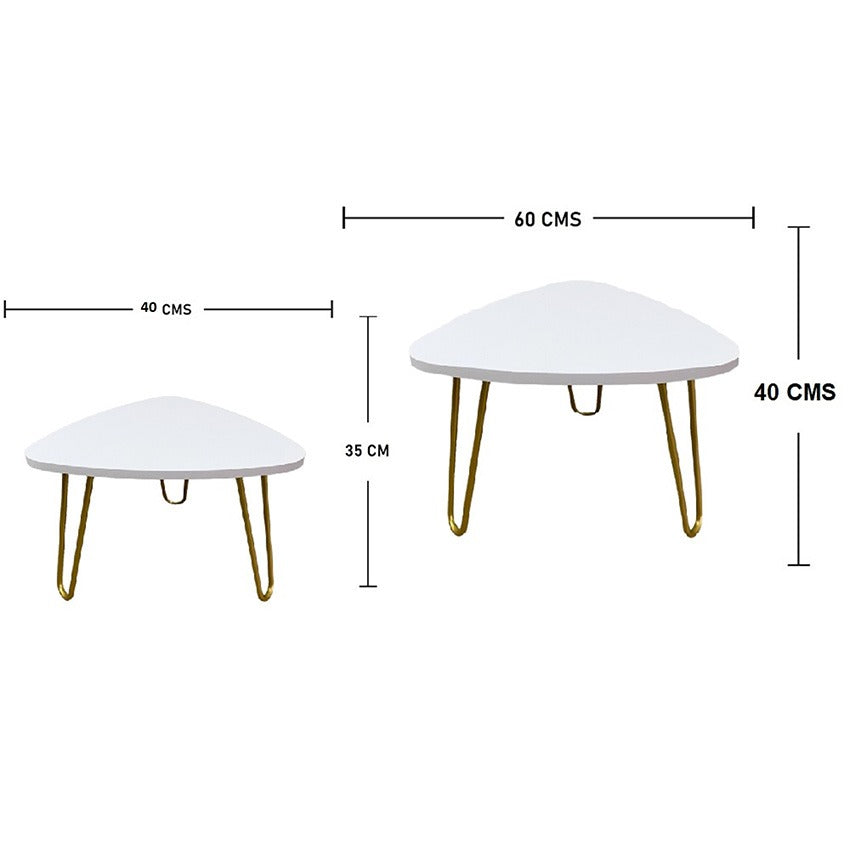 Set de Mesas de Centro Triangulares en melamina color blanco en 15 mm con protección antimicrobiana al 99.9 % y patas metalicas con pintura electroestatica color dorado.El tiempo de entrega de este producto es de 3 a 8 días hábiles.Importante: Este producto no incluye elementos decorativos ni ambientación y El color presentado en la fotografía es una aproximación al color real.