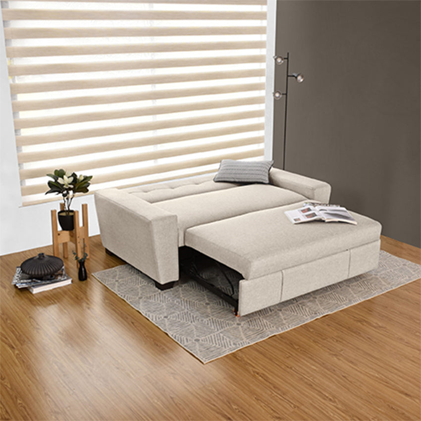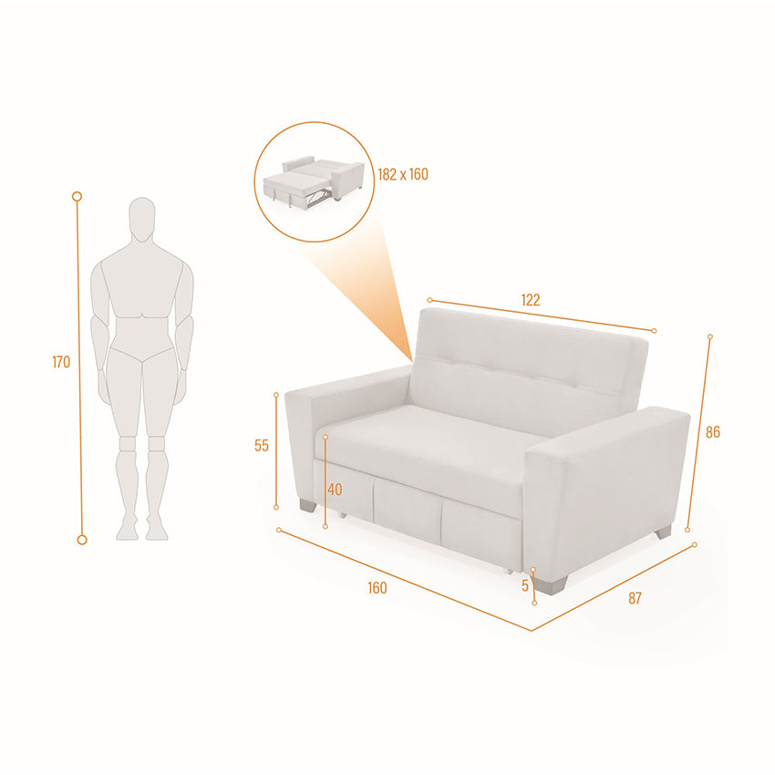 Modernidad y practicidad que resalta en los espacios. Está fabricado en madera pino relleno de espuma y guata tapizado en tela poliéster y cuenta con brioni en la parte inferior. Se puede reclinar en 3 posiciones y cuenta con herraje de cajón que permite desplegar otro modulo para completar la cama. El modo cama es de 122 x 180 cm de largo.Dimensiones: 160 cm ancho x 87 cm largo x 86 cm altoPeso del Producto: 51 kg - Peso que soporta: 200 kgIncluye: 1 Sofá Cama.No incluye elementos decorativos.Ensamble: No aplicaEl color del mobiliario en la fotografía es una aproximación al color real puede variar por la luz ambiente y la diferencia en la resolución de la pantalla del computador o dispositivo móvil.