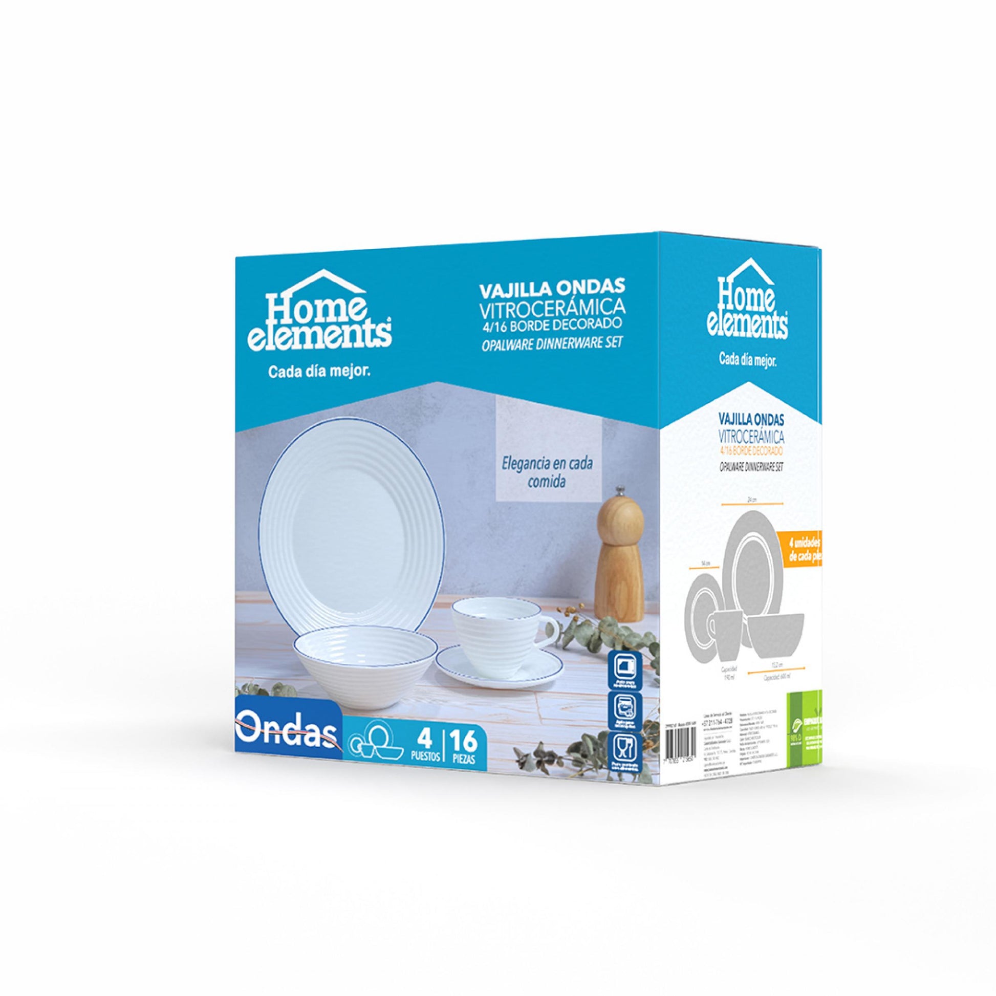 Dale un toque moderno y elegante a tu mesa con la Vajilla Ondas Colores Home Elements, elaborada en vitrocerámica, un material resistente, liviano y perfecto para el uso diario. Sus delicados bordes en color negro, azul o rojo realzan cualquier ambiente y combinan con todo tipo de decoración. Con 16 piezas para 4 puestos, esta vajilla es ideal para servir ensaladas, postres, snacks y tus comidas favoritas en esta temporada. Apta para microondas, lavavajillas y contacto con alimentos, ¡una vajilla práctica, duradera y hermosa para compartir en familia!, Peso (Kg) 4,46, Alto 26,5, Ancho 22, Largo 26